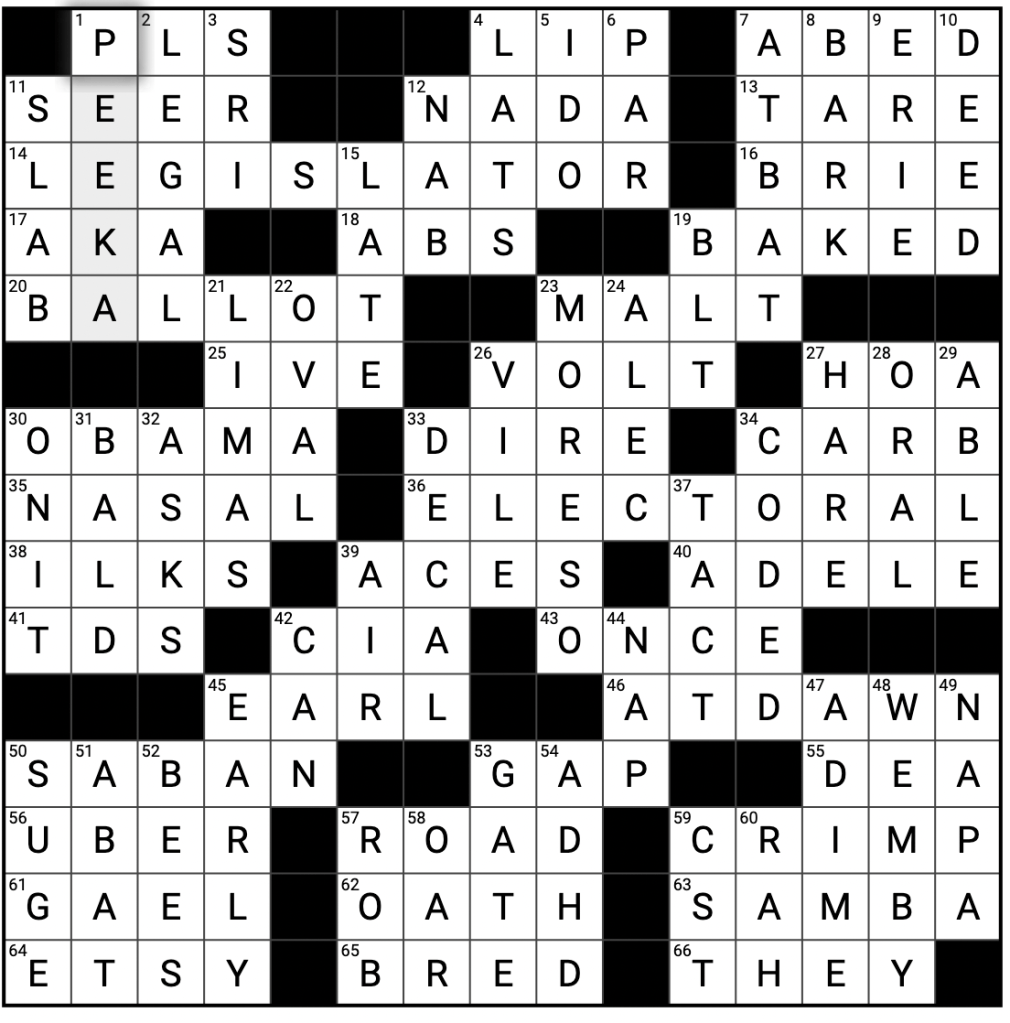 1A PLS- Texter’s please 4A LIP- Backtalk 7A ABED- What one might sleep in (2 words) 11A SEER- Fortuneteller 12A NADA- Zilch 13A TARE- Useful scale button 14A LEGISLATOR- Senator or Representative 16A BRIE- Soft cheese 17A AKA- Alias letters 18A ABS- What a crunch might work 19A BAKED- Made cookies 20A BALLOT- What a voter might fill out 23A MALT- Ice cream drink 25A IVE- “Now ___ seen everything!” 26A VOLT- Electrical unit 27A HOA- Residential community organization 30A OBAMA- 44th U.S. President 33A DIRE- Urgent 34A CARB- Low-___ diet 35A NASAL- Nose related 36A ELECTORAL- Like a political “college” 38A ILKS- Types 39A ACES- Top poker pair 40A ADELE- “Someone Like You” singer 41A TDS- Points in football, abbrv. 42A CIA- Spy organization 43A ONCE- A single time 45A EARL- ___ Grey tea 46A ATDAWN- When the rooster crows (two words) 50A SABAN- Crimson Tide coach Nick ___ 53A GAP- Empty space 55A DEA- “Breaking Bad” organization 56A UBER- Lyft competitor 57A ROAD- Pothole’s place 59A CRIMP- Pinch together 61A GAEL- Scottish Highlander 62A OATH- Solemn vow 63A SAMBA- Brazilian dance, Popular Adidas shoe 64A ETSY- Crafts website 65A BRED- Raised, as racehorses 66A THEY- He and she