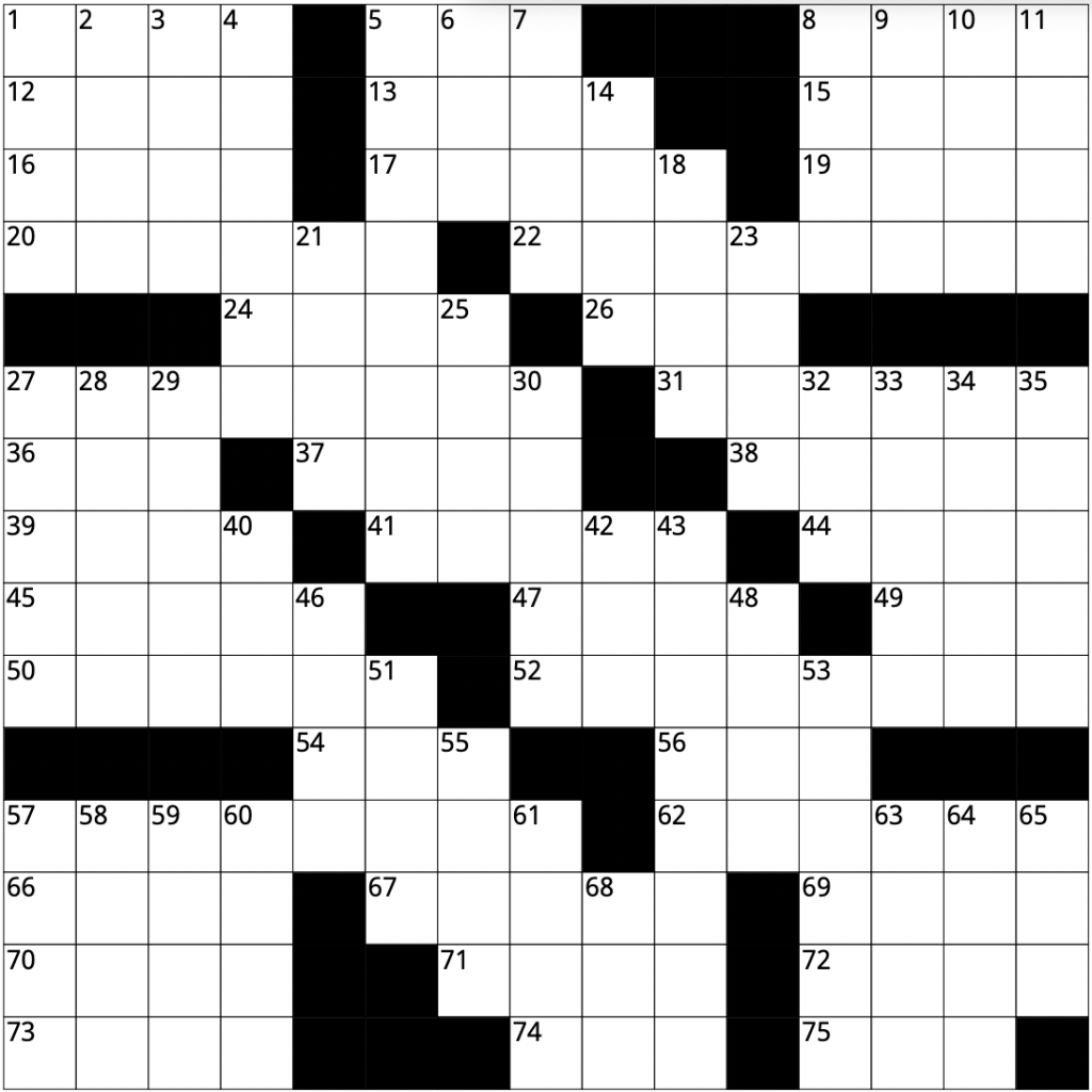 1: “___ fair in love and war” 2: Chimney residue 3: Actress Jessica 4: Orzo and ziti 5: Spider, for one 6: Tavern 7: Male deer 8: Junk e-mail 9: Give a hoot 10: On __ ___ with (equal to) 11: Wrestling surfaces 14: iPhone assistant 18: Norse trickster 21: Object of worship 23: Killer whale 25: Half: Prefix 27: Katniss’s partner in “The Hunger Games” 28: Batman’s sidekick 29: Silly 30: Summary 32: LAX info 33: Suspect’s story 34: Gal of “Wonder Woman” 35: English class assignment 40: Sweet potato 42: Mess up 43: Paper cutters 46: The ___ (game with virtual people) 48: Campbell’s product 51: Opera solo 53: Harvested 55: Doing nothing 57: Speedy 58: “Morbius” star Jared 59: Afghanistan neighbor 60: Small horse 61: Per person 63: Marathon, e.g. 64: Spanish uncles 65: Spanish uncles 68: Chinese chairman