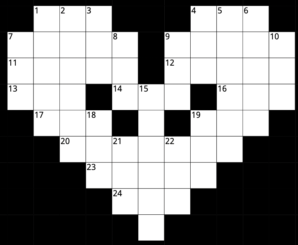 1: How one may measure heart rate 4: Catchy song 7: Valentine symbol 9: Biblical tower site 11: On a daily ___ 12: Social stratum 13: Ump’s call 14: The Raven poet 16: Chow down 17: “Mayday!” 19: Communication for the deaf, abbr. 20: Turns down 23: Venetian waterway 24: Soap unit