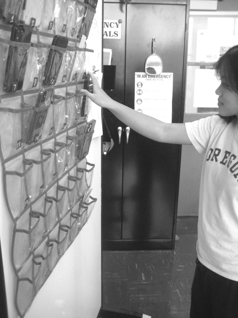 Senior Lily Yao places phone in cell hotel.